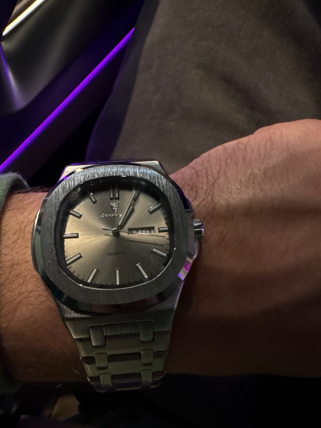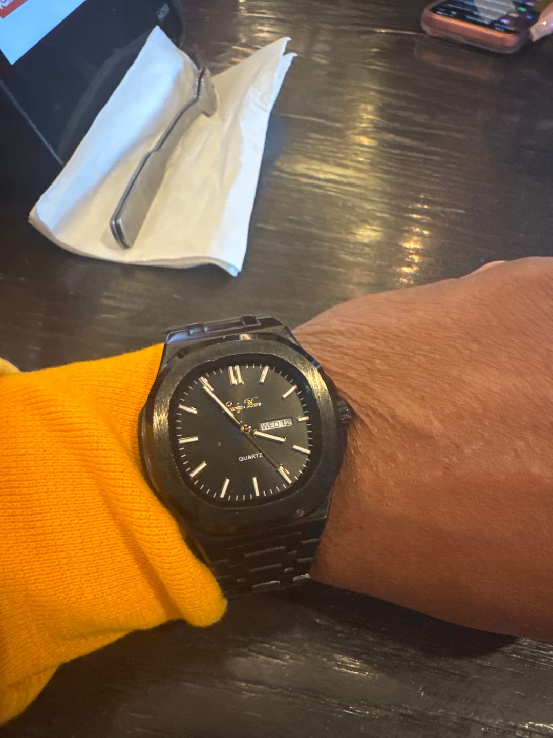 I bought both these watches, loved the way they looked coming out of the box, so I just had to take a photo of them before I put them on. The tool provided made it very easy to take out a link to make it fit properly. I've had many compliments on both watches. Worth every dollar.